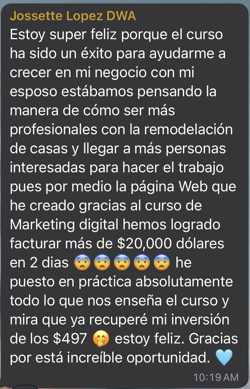 Mas abajo en esta pagina, veras los modulos incluidos en este curso de formacion, recibiras el curso en si, una comunidad gratuita de propietarios de negocios con ideas de todos los niveles de experiencia dispuesta ayudarte y por supuesto acceso a mi si tienes alguna pregunta.
